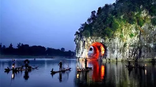 后游览2017年CCTV春节分会场【象鼻山】,象鼻山是桂林的城徽山,是桂林旅游的标志山,它坐落在桂林市中心的漓江与桃花江汇流处,形似一头鼻子伸进漓江饮水的巨象,象鼻和象腿之间是面积约一百五十平米的圆洞,江水穿洞而过,如明月浮水。坐落西岸的象山水月与漓江东岸的穿月岩相对,一挂于天,一浮于水,形成"漓江双月"的奇特景观。
