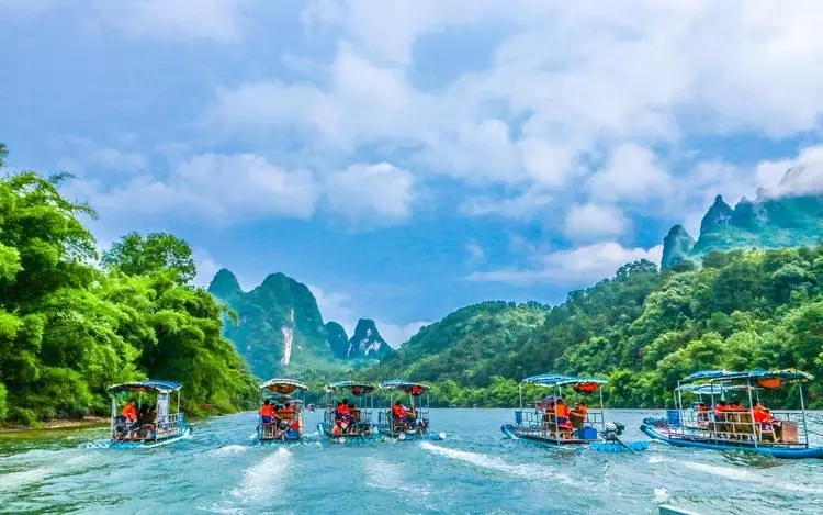 早餐后乘车赴磨盘山码头,乘豪华三星环保船游览【5A漓江风景区】(约4小时,含船餐航空套餐),感受唐代诗人韩俞笔下:“江做青罗带,山如碧玉簪”的漓江风光,漓江像蜿蜒的玉带,缠绕在苍翠的奇峰中,造化为世界上规模最大、景色最为优美的岩溶景区,沿途欣赏杨堤烟雨,浪石仙境,九马画山、黄布倒影,兴坪佳境……游人仿佛置身于一幅流动的山水画之间。下船后乘坐电瓶车至停车场(费用已含);
