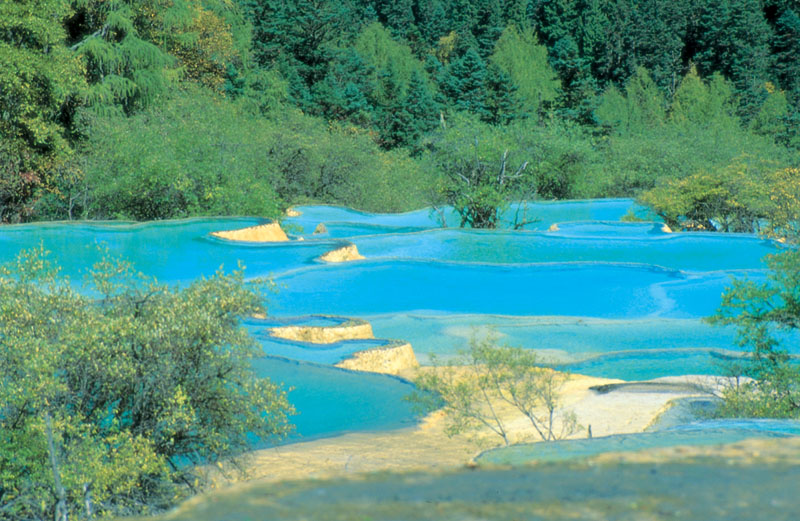 黄龙:黄龙以其雄、峻、奇、野的风景特色,享有“世界奇观”、“人间瑶池”的美誉.近千个彩池规模不同,形状各异。此时此地,恍若进入瑶池仙境。黄龙地区海拔3000米以上,广泛发育着清晰的第四纪冰川遗迹,其中以岷山主峰雪宝鼎地区最为典型。其特点是类型全面,分布密集,最靠东部。此区山高范围广,峰丛林立,单5000米以上高峰就达7座,其中发育着雪宝鼎(5588米)、雪栏山(5440米)和门洞峰(5058米)三条现代冰川,使此区域成为中国最东部的现代冰川保存区。主要冰蚀遗迹有角峰(分布于海拔4000米以上)、刃脊(3800米以上)、冰蚀堰塞湖(3900米以上)等;主要冰碛地貌有终质、中碛、侧碛、底碛等;分布于各冰川谷中,其中终债主要分布高程为3000~3100米、3550~3650米、3750~3850米。现代冰川和古冰川遗迹及其与钙华之间的关系等,均具有重要的科研价值。