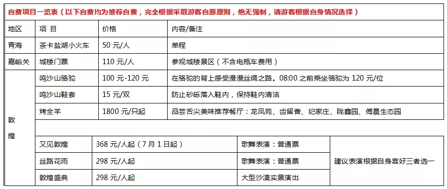 1、行车时间较长建议游客自备一些零食在路上用,途中可欣赏到西北独有的戈壁美景和祁连山上终年不化的积雪;