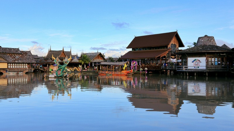 【杜拉拉水上市场】芭堤雅水上市场,又名芭堤雅四方水上市场、杜拉拉水上市场。位于芭提雅市中心沿素坤逸干道往东方向约5公里处,泰语里叫"四方水上市场",因其融汇了泰国东部、西部,东北部及南部四个区域水上市场的特色而得名。水上市场里水路纵横,水面上木楼别具风格。在水市里既可以吃到来到泰国各地的风味小吃,也可以买到产自于泰国各地方的特产以及工艺品,更可以搭乘小木舟,在湖里荡漾,穿梭于桥亭之间,或是跑到湖中心最高处,坐上索道,飞驰下来,体验双脚掠过水面的刺激与凉意。