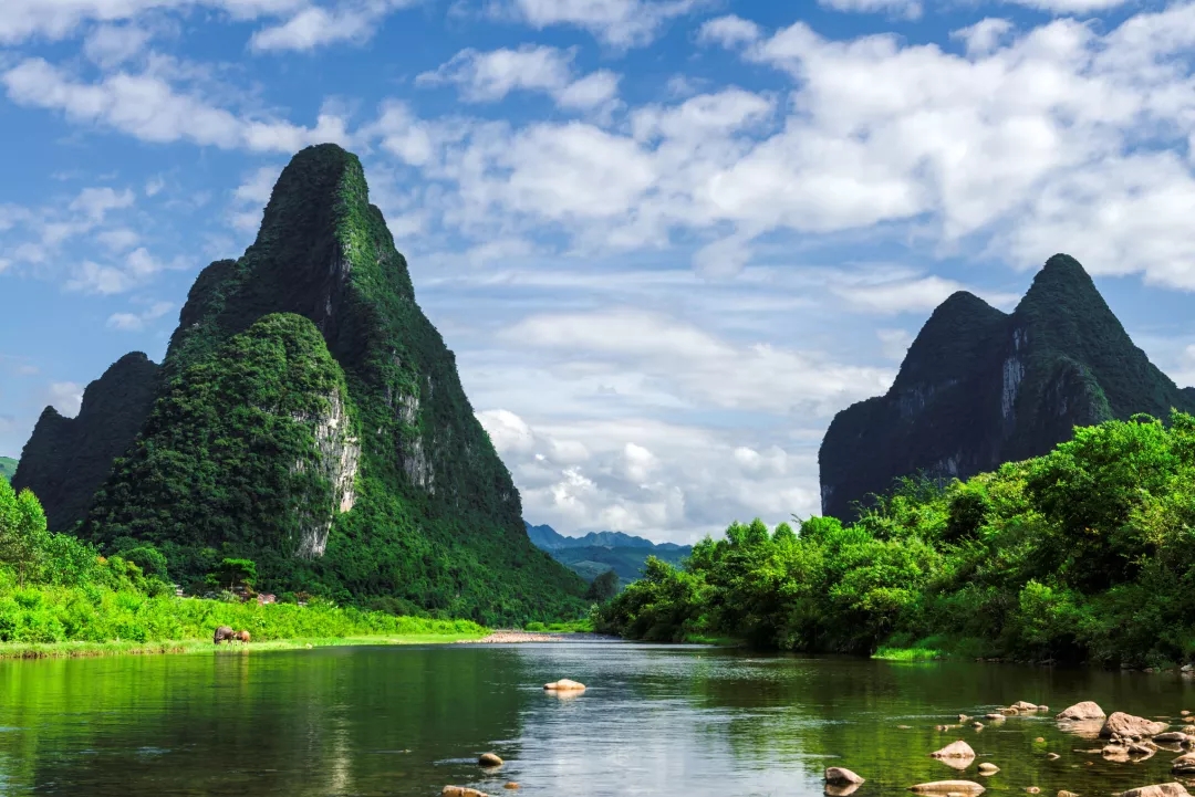 早餐后乘车赴码头,乘船游览百里画廊—【三星级豪华大漓江风景区】(约4.5小时左右,中餐为航空餐)感受唐代诗人韩俞笔下:“江做青罗带,山如碧玉簪”的漓江风光,漓江像蜿蜒的玉带,缠绕在苍翠的奇峰中,造化为世界上规模最大、景色最为优美的岩溶景区。在美国CNN评选的《全球最美的十五条河流》中,漓江是我国唯一一条入选的河流。沿途欣赏杨堤烟雨,浪石仙境,九马画山……游人仿佛置身于一幅流动的山水画之间(下船后电瓶车15元/人费用自理)。